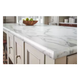 - White engineered stone countertop with single thickness, straight edge, and removable matching backsplash