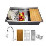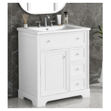 - The ceramic sink boasts a water-resistant finish, an overflow, and three pre-drilled faucet holes compatible with an 8-inch faucet (not included). Storage is optimized with one cabinet, a door shelf, and two drawers, perfect for organizing towels, soaps, and toiletries. The painted finish ensures the cabinet is water-proof, stain-resistant, and easy to maintain.
