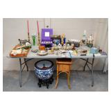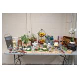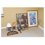 ART & DECOR Modern Tiffany Style Table Lamp, Three-Piece Chinoiserie Paneled Wall Art, Dinh Tho Vietnamese Framed Art Prints, Large Parisian Street Scene Print, Vanity Mirror, Three Plant Wall Frame, Arched Hollywood Regency Style Mirror, Three Monkeys Table Lamp, Collection of Home Decor, Collection of Faux Greenery, Whimsical Garden & Home Decor, Vintage Prints, Table Runner, Wall Hangings, Greenery & More, Framed Animal Prints and Decor, Sports and Humor Illustrations, Monkey Towel Rack and Buddha Figurines, Windsor Art Product Framed London Views, Modern Home Decor, Collection of Antique Glassware, Metamorphosis IV: Water Wings by J. Fulks Sjogren Lithograph, Two Table Lamps, Modern Home Decor, Handmade Crochet Cotton Lace Bedspread & Birdhouse Hanging Coat Rack.