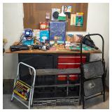 TOOLS & HARDWARE Radius Garden Pro Weeder, Two-Wheel Hand Truck, Craftsman Mini Garden Tiller, Aluminum, Emergency, Flat & Round Shovels, Reed No. 203 Table Vise, Vintage Tool Bench, Gorilla Ladders 4-In-1 Aluminum Ladder, Collection of Woodworking Jigs, Two-Tier Shelving Unit, Collection of Extension Cords and Cord Reel, Metal Frame Storage Shelf, Rolling Metal Frame Storage Shelf #1, Rolling Metal Frame Storage Shelf #2, Metal Storage Shelf, Metal Storage Shelf, Two Metal Storage Shelves, Jeep Wheelbarrow, Rubbermaid Two-Door Plastic Storage Cabinet, Garden and Household Chemicals, Yard Tools and Stands, Plastic Storage Shelf and Tote & Two Aluminum Extension Ladders.