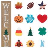 Interchangeable Welcome Sign for Front Porch- 45"X9" Large Standing/Hanging Wooden Sign with 12 PCS Replaceable Icons for 4th of July Fall Halloween Porch Wall Yard Decorations