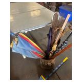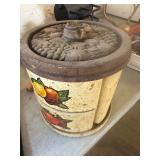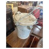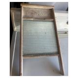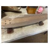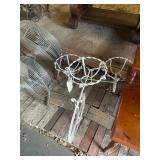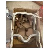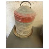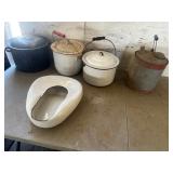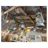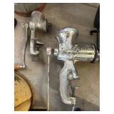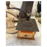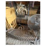 WOOD & METAL ANTIQUE COLLECTIBLES* 2 Red Glass Railroad Lamps, Barn Lantern, Coleman Lanterns, Wood Egg Crate, Wood Cabbage Mandolin, Scrub Board w/Glass Rib Plate, Single Tree, Cast Iron Hand Grinders, Military Rag Can, several Large Shortening Tins, Cast Iron Fireplace Log Grate, Deer Antler Fireplace Tool Set, C/I small Dutch Oven, Griddle, Corncob Muffin Pan, Iron Cannon Ball, C/I Cobbler Stand, C/I & Wood Coffee Mill, C/I Cow Bank, Old Butcher Knife, Vintage Mail Box, Enamel Pots, Enamel Roasters, Buck Saw, Metal Planter Stands, Roll Plastic Coated Fence Wire, Wood Drink Can Crusher, Vintage Nut Cracker, Wood Hand Rack, Galvanized Kerosine Can & Chicken Waterer, and more!