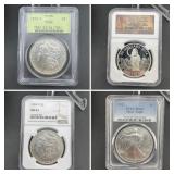 Carson City Morgan Dollars, graded Morgans (PCGS/NGC), American Silver Eagle MS69, Barber & Walking Liberty silver, proof sets, copper rounds, and more collectible coins.