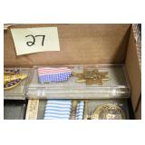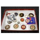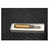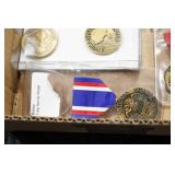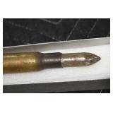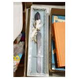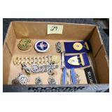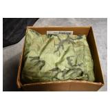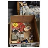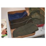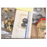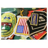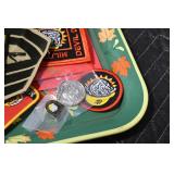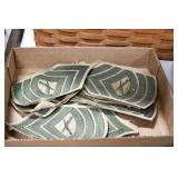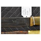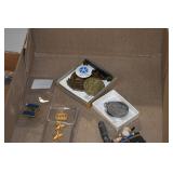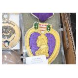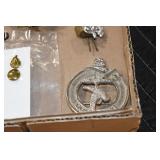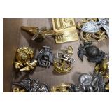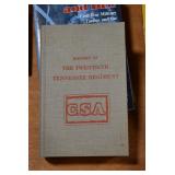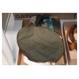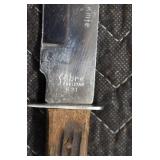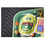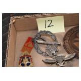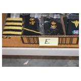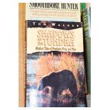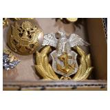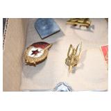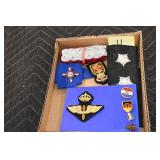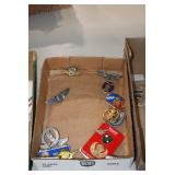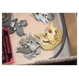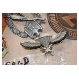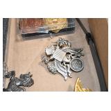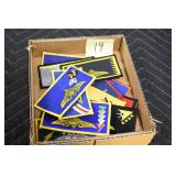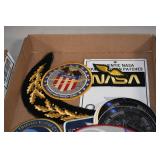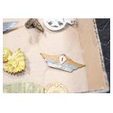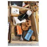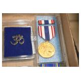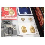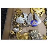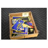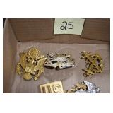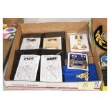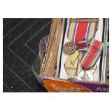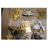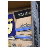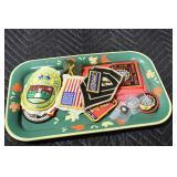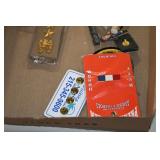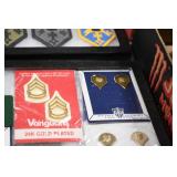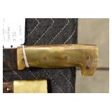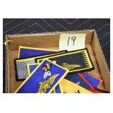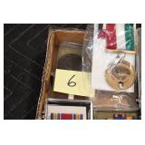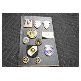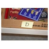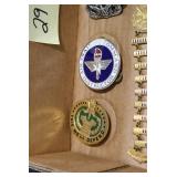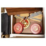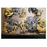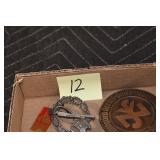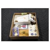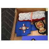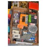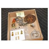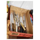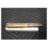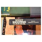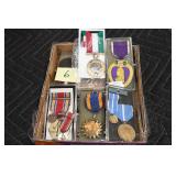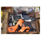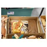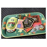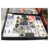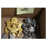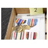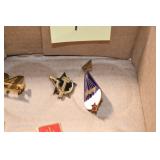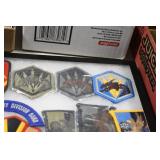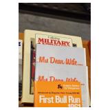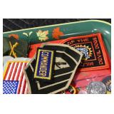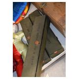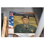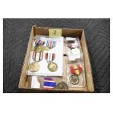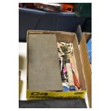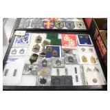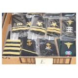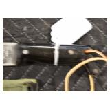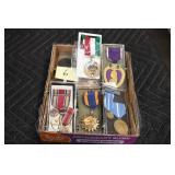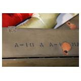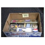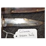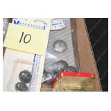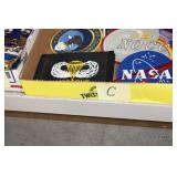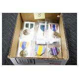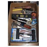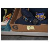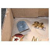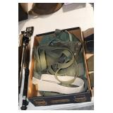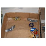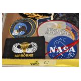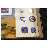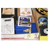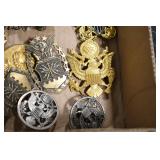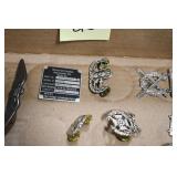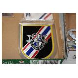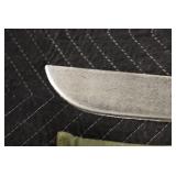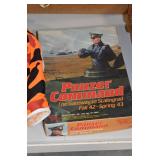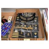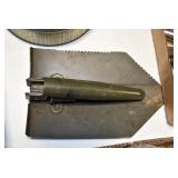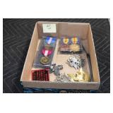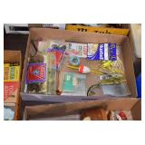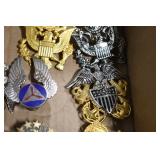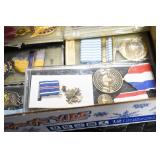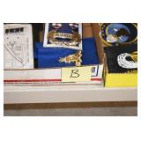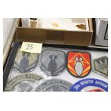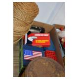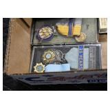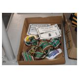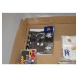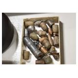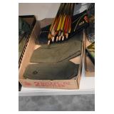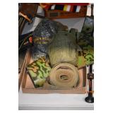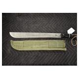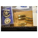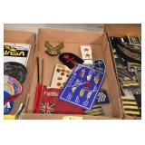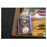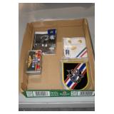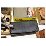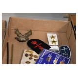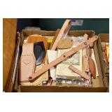 Gun, Fishing, and Military Related: Swords, Machetes, Large Amount of Folding, Pen, and Sheath Knives, Tasco Scopes, Various Ammunition, Shotgun Shells, Carved Wooden Bullets, NRA Glass Set, NRA Statue Figures, Cleaning Rods, Reloading Powder, Targets, Fishing Rods, Large Military Shells, Large Amount of Military Pins, Badges, and Patches, Military Hats and Helmets, Wooden Ammo Crates, and Other
