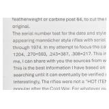 242R. Winchester – Mod. 70 Mannlicher No. (7003) – 270 Win. Cal. Bolt Action Rifle – w/19” Barrel w/Blade Front and Adjustable Rear Notch Sights – Blued Finish – w/Deluxe Checkered Pistol Grip Wood Stock w/Raised Cheek Rest and Factory Butt Pad – w/Sling Loops – Research Shows There were Only 2,401 of this Style Rifle Manufactured in the Late 1960’s, Only 593 were Manufactured in the 270 Win. Caliber – Manufactured 1969