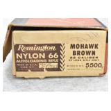 268R. Remington – Mod. Nylon 66 – 22LR Cal. Semi-Auto Rifle – w/20” Barrel w/Blade Front and Adjustable Rear Sights – Blued Finish – w/Factory Checkered Capped Mohawk Brown Plastic Stocks w/Factory Butt Plate & White Accents – Rear Magazine Tube Load Through Butt Stock – As New w/Factory Box – Box Numbers to Gun!