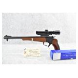 324R. Thompson Center – Mod. Contender – 357 Rem. Max. Cal. Single Shot Pistol – w/Super 14” Barrel w/Blade Front Sight – Blued Finish – w/Factory Wood/Rubber Pistol Grip & Wood Forearm – w/Thompson Center 2.5x Scope w/Base – As New w/Scope Box!