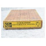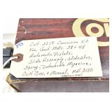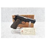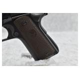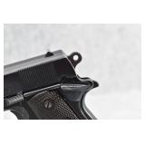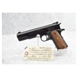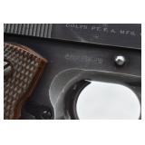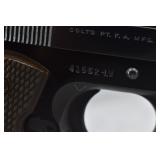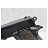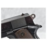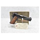 295R. Colt – Mod. 1911 A1 U.S. Army – 45 Auto Cal. Semi-Auto Pistol – w/5” Barrel w/Blade Front and Rear Notch Sights – Parkerized Finish – w/Factory Checkered Brown Plastic Grips – w/1 Factory Detachable Magazine – w/2-Piece Contract Box – Manufactured 1943