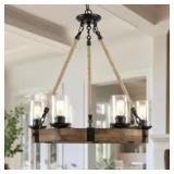 LNC 25 in. W Farmhouse Chandelier 6-Light Black Wagon Wheel Wood Island Chandelier with Clear Seeded Glass Shade and Ropes