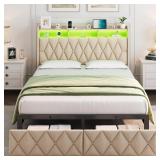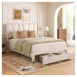 (77) Full Bed Frame with Storage Drawers, Upholstered Full Size Platform Bed with 47" Tall Headboard and Wingboard, No Box Spring Needed, Noise Free, Easy Assembly, Wooden Support Slats, Beige