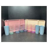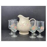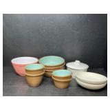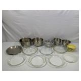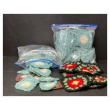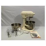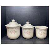 Kitchen and dining categories are strong and include a KitchenAid stand mixer with bowls, attachments and guide, plus KitchenAid slicer/shredder and grinder attachments. Tableware includes multiple groupings of Pfaltzgraff Tea Rose dinnerware and accessories, etched and clear stemware lots, and a wide range of Pyrex and Anchor Hocking baking dishes, Pyrex Gooseberry Cinderella mixing bowls, CorningWare casseroles, Pampered Chef stoneware, roasters, cookware, utensils and small appliances. Additional offerings include crafts and sewing supplies (yarn, patterns, needlework, calligraphy), linens, country décor miniatures, books and cookbooks, media collections (VHS/DVD/CD/records), sports memorabilia, garden tools and storage totes/boxes—an ideal catalog for collectors, resellers and household buyers.
