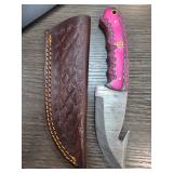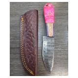 Damascus Steel Knife with Pink Handle and Leather |