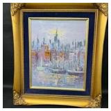 - Lot #82 - Signed Framed Harbor Cityscape Painting – Gold Wood Frame, Textured Impressionist Style