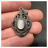 - Lot #183 - Sterling Silver Pendant w/ Mother of Pearl & Marcasite – Vintage Filigree Design – 10.54 Grams