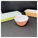 - Lot #188 - Vintage Pyrex Bakeware Lot – Pink Mixing Bowl, Green & Tan Loaf / Casserole Dishes (USA Made)