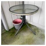 - Lot #254 - Vintage Round Outdoor Patio Table with Glass Top and Woven Edge Trim