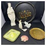 - Lot #16 - Vintage Decorative Collectibles Lot – Madonna & Child Statue, Alabaster Birds, Tole Tray, Art Plates & Shell Décor