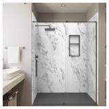 (11). ****COMES WITH MATTE BLACK SHOWER BASE****CASTICO 60 in. L x 32 in. W x 84 in. H Alcove Solid Composite Stone Four Piece Shower Wall Set in Carrara