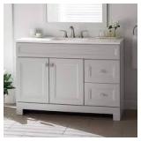 ITEM IS NEW AND REFUNDABLE BEFORE ITEM LEAVES THE BUILDING AND IF DIFFERENT THEN DESCRIBED BELOW. RETAIL: $699 Swappable bathroom cabinet doors and drawers for easy install 48 in bathroom vanity and sink includes solid surface vanity top Includes vanity top, cabinet soft close hinges, cabinet hardware