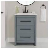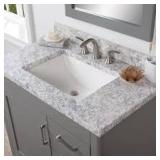 42 in W x 19 in D x 34.5 in H vanity with engineered stone top Features 2-hardware sets, 3-drawers and 1-cabinet with shelf Includes top, backsplash, and single sink; faucet not included
