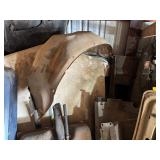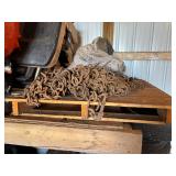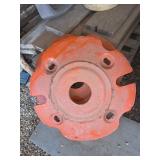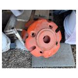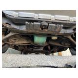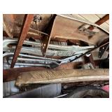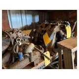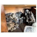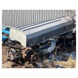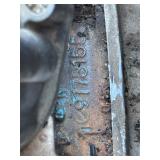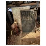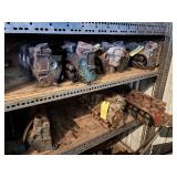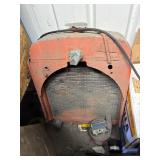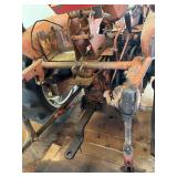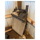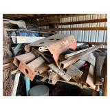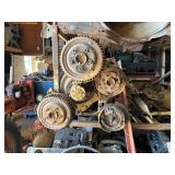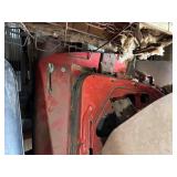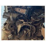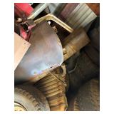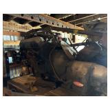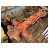 Disassembled Alice Chalmers D 15 series 2 tractor with engine block, and miscellaneous parts. Miscellaneous Alice Chalmers tractor parts, including D 15 hood, grill series, 2 gas tank, differentials, driveshaft, fans, transmissions, and other related parts.