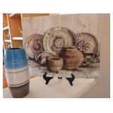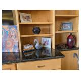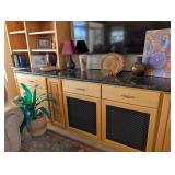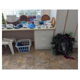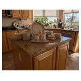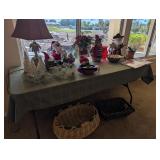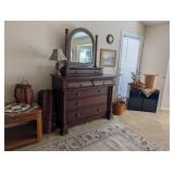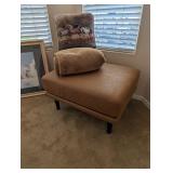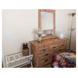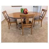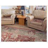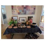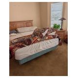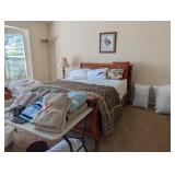 Curved leather sofa with matching chairs; Wood dining room table w/ 4 chairs; casual dinette set; King headboard; two queen mattress sets; bedroom furniture; casual chairs and tables; framed art and decor |