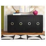This versatile credenza is fashioned with round, gold-finished handles and inset paneling for the right Art Deco look in your living room or dining room. The clean-lined frame is made from engineered wood with a neutral finish, and it rests on a plinth-style base. Four cabinet doors open to reveal adjustable shelf space for dishes, media items, and wine glasses. This credenza has a 64" wide surface that easily accommodates trays of appetizers and a table lamp. Plus, cable management in the back helps to tame those pesky wires.