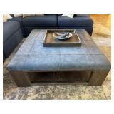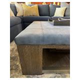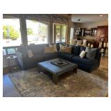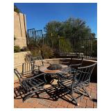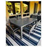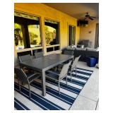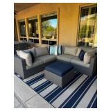 - Modern outdoor patio furniture including table and chairs, sectional sofa with cushions and center table/ottoman, outdoor rug, and fire table with chairs