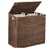 Large Water Hyacinth Double Laundry Hamper Basket w/ 2 Liner Bags. Designed with a durable metal frame and a spacious interior to hold up to 100 pounds of clothes, linens, and bedding materials. Sustainable and beautiful water hyacinth is handwoven to create a textured surface that adds both reliable durability and natural elegance to any room. Two removable linen liners protect your clothes and let you sort lights and darks, while machine-washable materials make them easy to clean. Carry your laundry around the house with ease; handle cutouts on the sides, and wooden handles on each liner make transport a breeze. Maintain a clutter-free space and keep odors at bay with the built-in lid, offering discreet coverage while adding a stylish finishing touch to your laundry room decor. Color Espresso.
