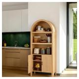 Best Choice Products 72in Tall Arched Pantry Cabinet w/Doors, 5-Tier Bookshelf, Armoire, Hutch, Bookcase, Storage Cabinet w/Adjustable Shelves - Natural Oak. Elevates any space with architectural charm. Perfect for adding a stylish touch to both small and large rooms. Complements kitchens, dining rooms, living rooms, and home offices. Elegant textured finish conceals storage while complementing contemporary and classic interiors. Features three open display shelves and two adjustable interior shelves to effortlessly accommodate books, decor, and larger items. Stands taller than most competitors, providing ample vertical storage to keep your space organized; overall demsions: 30"(L) x 15.75"(W) x 72"(H); TOTAL WEIGHT CAPACITY: 134.2 lbs.