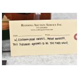 Redding Auction Service Inc. reserves the right to hold any or all merchandise purchased by personal check until the check has cleared the bank. If shipping is requested/required by the purchaser, all packing and UPS/USPS shipping charges will be paid prior to shipping. Forms of Payment Accepted for Purchases: CASH or PENNSYLVANIA CHECKS OUT OF STATE CHECKS WITH PRIOR APPROVAL MC/VISA/DISCOVER/AMEX ACCEPTED (A 4% ADMINISTRATIVE FEE WILL BE CHARGED) YOUR BIDDING ACCEDES YOUR ACCEPTANCE OF THESE CONDITIONS OF SALE.