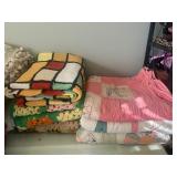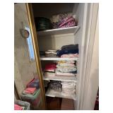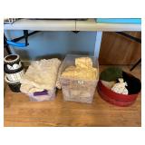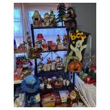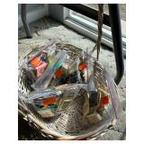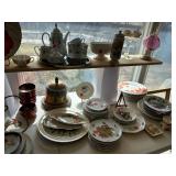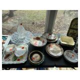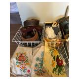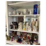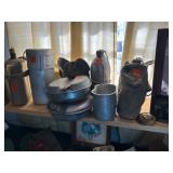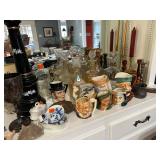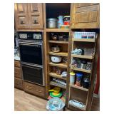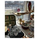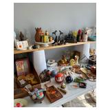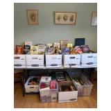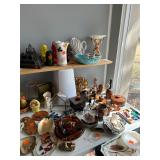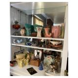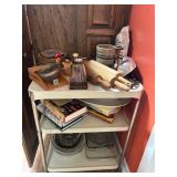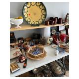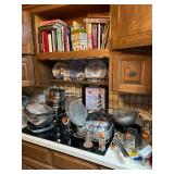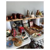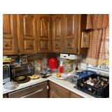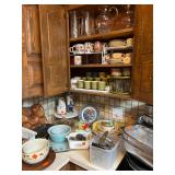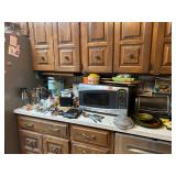 Kitchen: pots pans, vintage glassware and promo cups, bakeware, keurig, microwave, utensils, silverware, china, platters, milk glass cake stands, silver service, salt and pepper shakers, tubs full of kitchen linens and more
