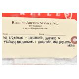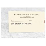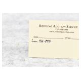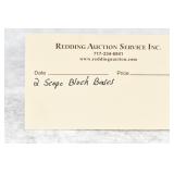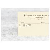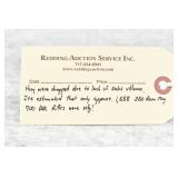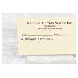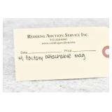 Redding Auction Service Inc. reserves the right to hold any or all merchandise purchased by personal check until the check has cleared the bank. If shipping is requested/required by the purchaser, all packing and UPS/USPS shipping charges will be paid prior to shipping. Forms of Payment Accepted for Purchases: CASH or PENNSYLVANIA CHECKS OUT OF STATE CHECKS WITH PRIOR APPROVAL MC/VISA/DISCOVER/AMEX ACCEPTED (A 4% ADMINISTRATIVE FEE WILL BE CHARGED) YOUR BIDDING ACCEDES YOUR ACCEPTANCE OF THESE CONDITIONS OF SALE.