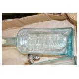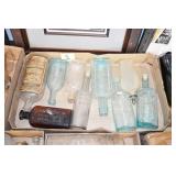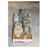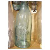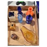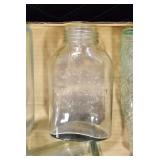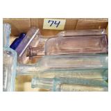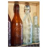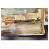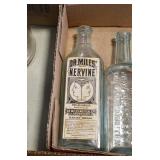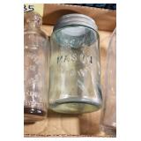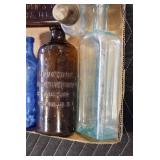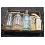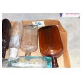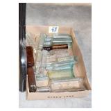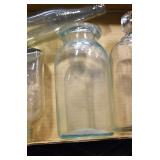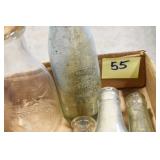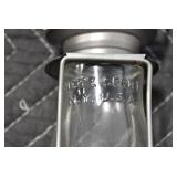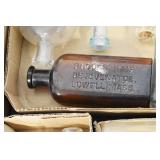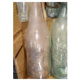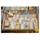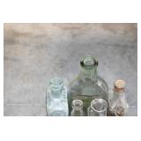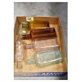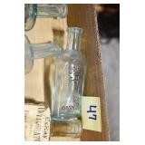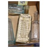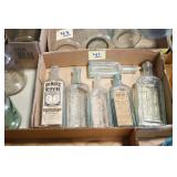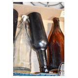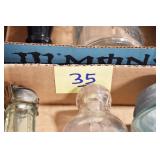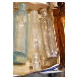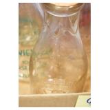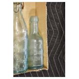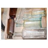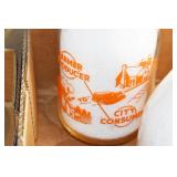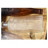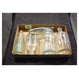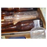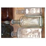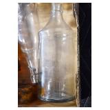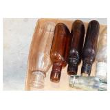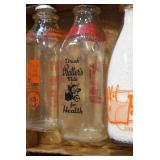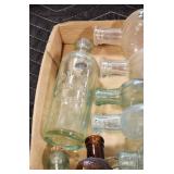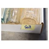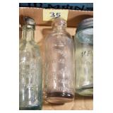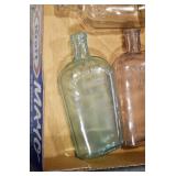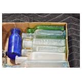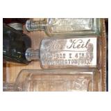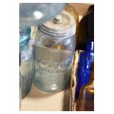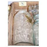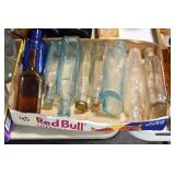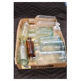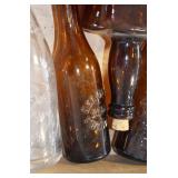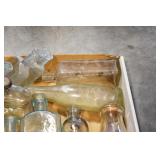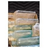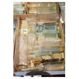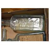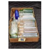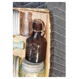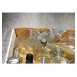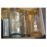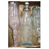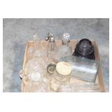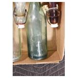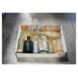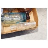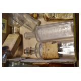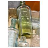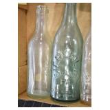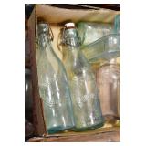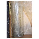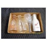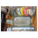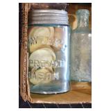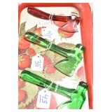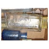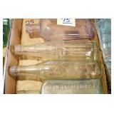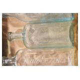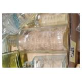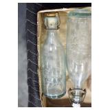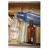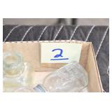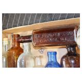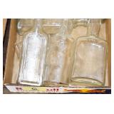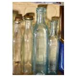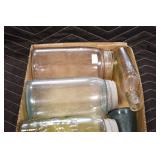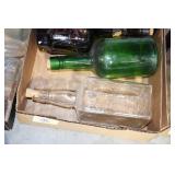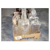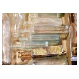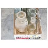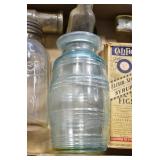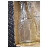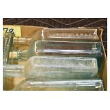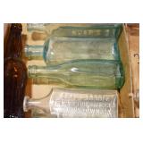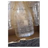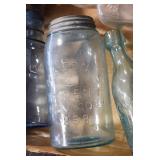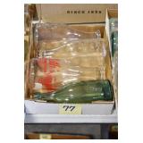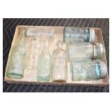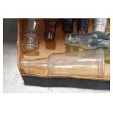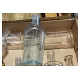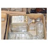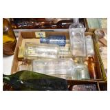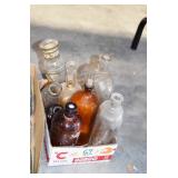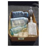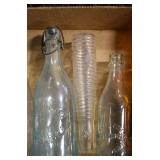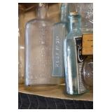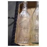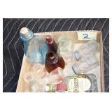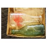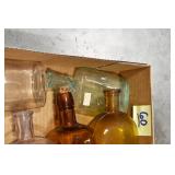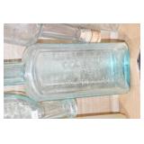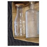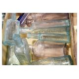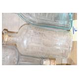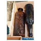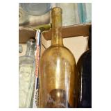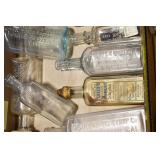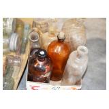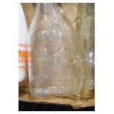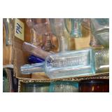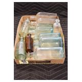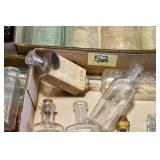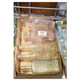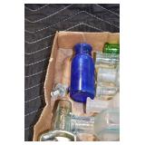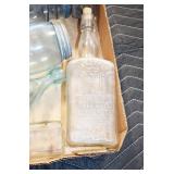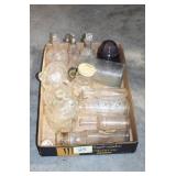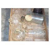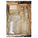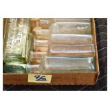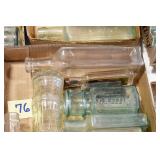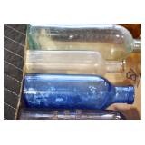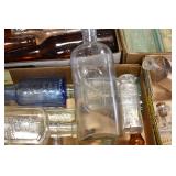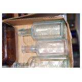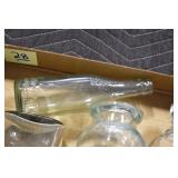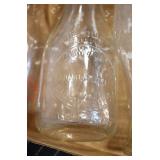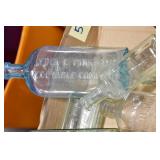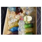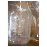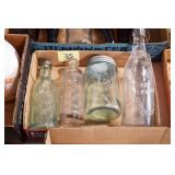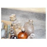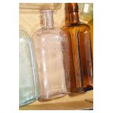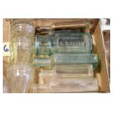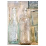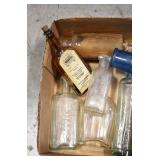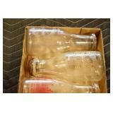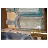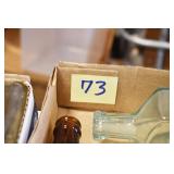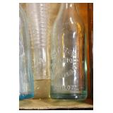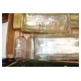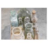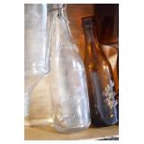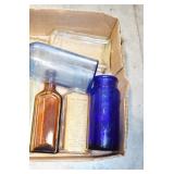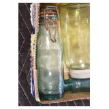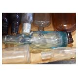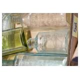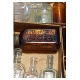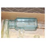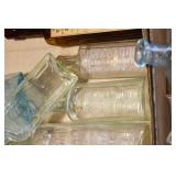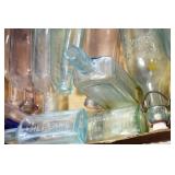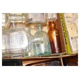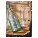 Antique Glassware: (90+) Lots of Various Clear and Colored Vintage Glass Bottles and Jars, Milk Bottles, Glass Candy Jars, Ruby Pen Mar Advertising Glasses, Uranium Glass, Pink Depression, Character Glasses, Peanut Butter Glasses, Sheffield Fine China Set, Oil Lamps, Stained Glass Hanging Lamp Shade, and Other