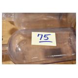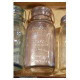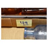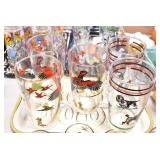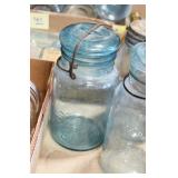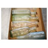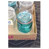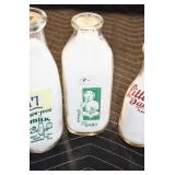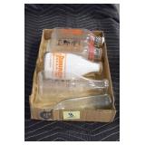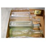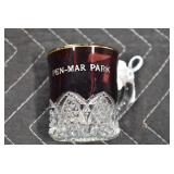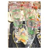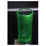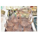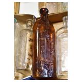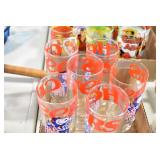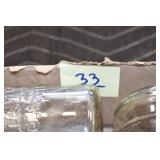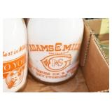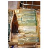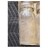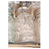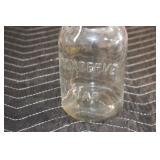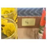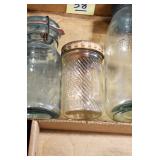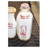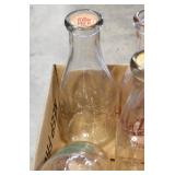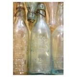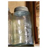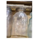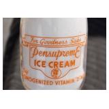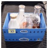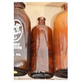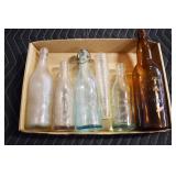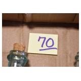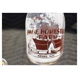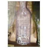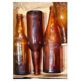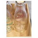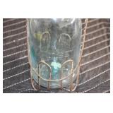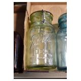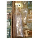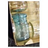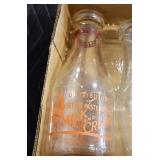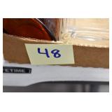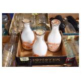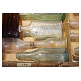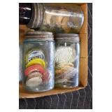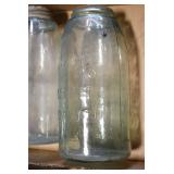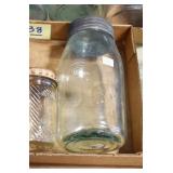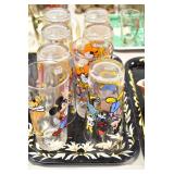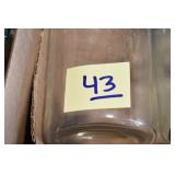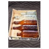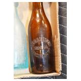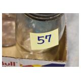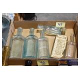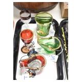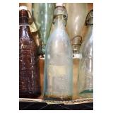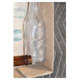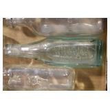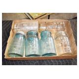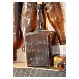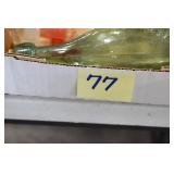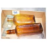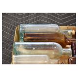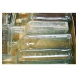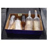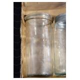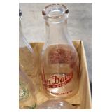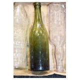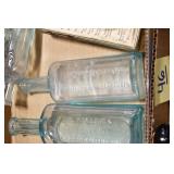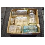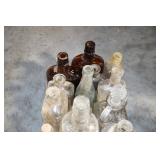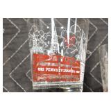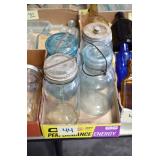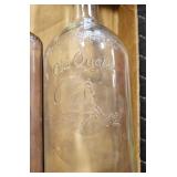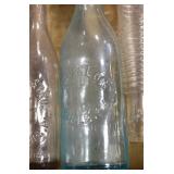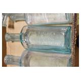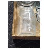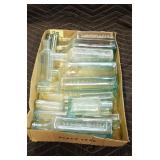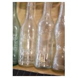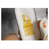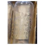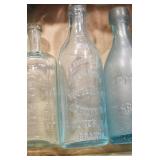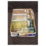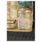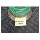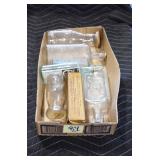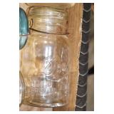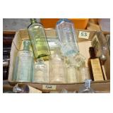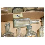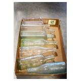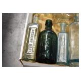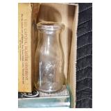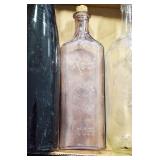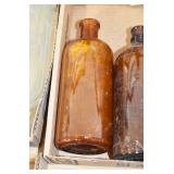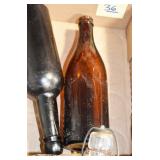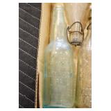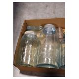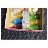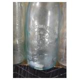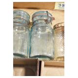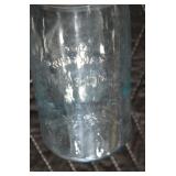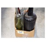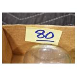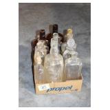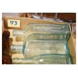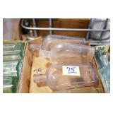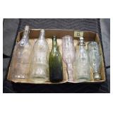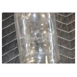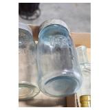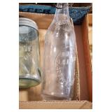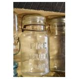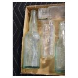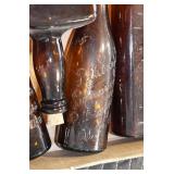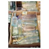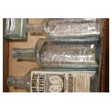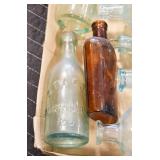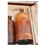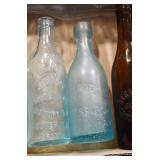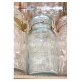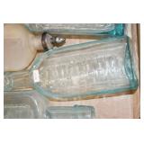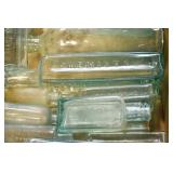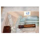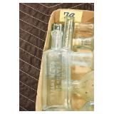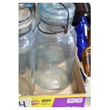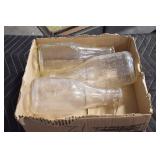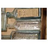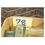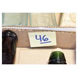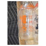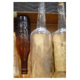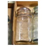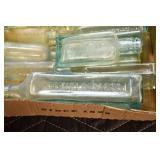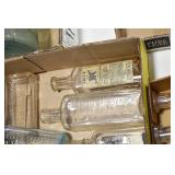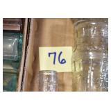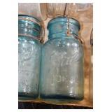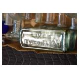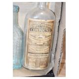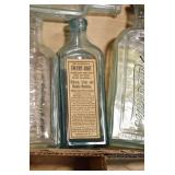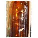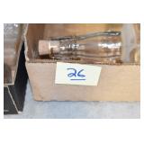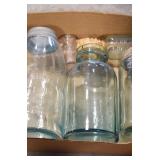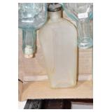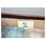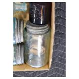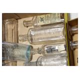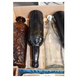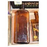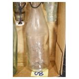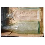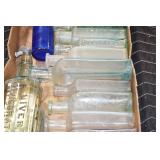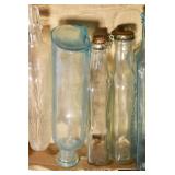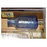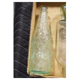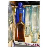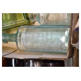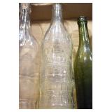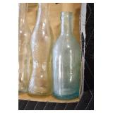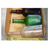 Antique Glassware: (90+) Lots of Various Clear and Colored Vintage Glass Bottles and Jars, Milk Bottles, Glass Candy Jars, Ruby Pen Mar Advertising Glasses, Uranium Glass, Pink Depression, Character Glasses, Peanut Butter Glasses, Sheffield Fine China Set, Oil Lamps, Stained Glass Hanging Lamp Shade, and Other