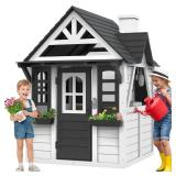 Outdoor Playhouse for Kids Ages 4-8, Wooden Play House with Doorbell, Phone, Kitchen Toys, Outdoor Kids Play Equipment, Casa Para Niñas (45”L x 65”H), White & Black