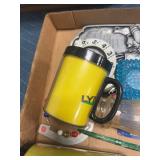 Stoneware bowl with misc glassware and silver ware |