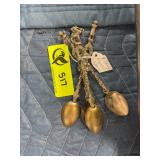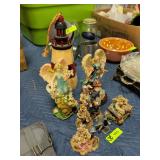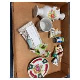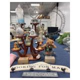 Decorative stand with misc figures, wall hangings, and more |