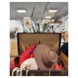 Vintage suitcase with various hats and artificial flowers |
