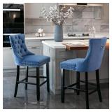 Contemporary Velvet Bar Stools Set of 2 with Button Tufting, Wooden Legs, Chrome Trim, Mid-Century Modern Design, Blue Multiple Family Members can use it for Daily Dining YHS-W1143P177249