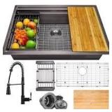Includes: kitchen faucet, sink bottom grid, drying rack, drain assembly, cutting board, and mounting hardware
