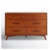 Provide a centralized storage solution for your bedroom or guest space with this 7-drawer dresser. It features a horizontal silhouette and tapered legs that create a mid-century modern look. The frame is made from a blend of solid and engineered wood, showcasing a unique surface pattern where the wood’s natural grain adds depth and character. With a combination of three small upper drawers and four larger lower drawers, it offers flexible organization for clothing and linens. We also love that the felt-lined top drawers help protect delicate items from snags.
