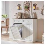 Tilt Out Laundry Hamper Cabinet, 22 Gallon Double Hidden Laundry Hamper, Wooden Trash Can Cabinet With 2 Drawers, Farmhouse Garbage Can For Bathroom, Kitchen, Living Room