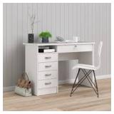 This clean-lined computer desk brings versatile storage and a modern style to your bedroom or dorm room. Crafted with engineered wood, it features a neutral finish that pairs well with transitional aesthetics. A rectangular top rests on a slim support on one side and a set of five drawers on the other. Tuck away your textbooks, notebooks, and study materials in the drawers and the open shelf above it, while an additional drawer under the top offers locked storage for important documents. We love that it finishes back and lets you choose where in your space you put it.