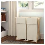 Sort, store, and haul laundry in HOUSEHOLD ESSENTIALS X-Frame Wood Double Laundry Hamper Sorter, a large capacity double clothes hamper that holds approximately 4 loads of laundry! This spacious 2-bag hamper sorter simplifies laundry day by pre-sorting laundry. 2 polycotton canvas bags hang on the 30 inch wide frame. Each cream colored bag, with drape lid that lays over the top of each side of the laundry sorter, hooks onto the raw wood X-frame. The bags latch on with fabric loops and then secure with additional hook and loop fasteners. The removable bags are machine washable with like colors (line dry), making it easy to haul dirty laundry out of the hamper (bag and all), and then wash everything (bag included!). The unfinished frame can be stained or painted to match your space, making this double hamper sorter a versatile addition to your laundry routine. This sorter can be used in any bedroom, bathroom or laundry room in your home. The collapsible frame allows this double hamper to save on space, even while it’s not in use. This makes it perfect for individuals or housemates in smaller apartments and rooms. Tuck it behind the door, beside the washer or in the closet until ready to use again. Give the sorter a personalized touch by staining or painting the raw wood to either match the room or add a pop of color. This X-frame laundry sorter has a wide variety of uses while also possessing a classic style. It is easy to assemble and put together; no special tools required.