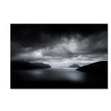 - This ready to hang and gallery-wrapped art piece features a black and white photograph of a cloudy sky over a mountain lake