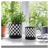 Jamesjoseph Stoneware Ceramic Planter Set with Drainage Tray - Black & White Checkered - Indoor/Outdoor - Set of 2 (Set of 2)