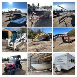 **FEATURED ITEMS** 2020 Bobcat T595 Tracked Skid Steer; Komatsu Avance PC128US Excavator; Bobcat 74” Heavy Duty Bucket; Virnig 78” Twin Ram Skeleton Grapple Bucket; Bobcat 15C Hydraulic Auger Attachment; Skid Steer Mount Shop Made Receiver Hitch Attachment. Plus Tomahawk Pallet Fork Attachment, Shop Made Skid Steer Mount Boom Mower Attachment, 2004 BBEX 25’ Gooseneck Trailer, 1987 Sea Ray 268 Boat and Much More!