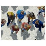 An immersive 60" x 50" aerial oil on canvas exploring the "complex social milieu" of the urban crowd. Zwadlo reconstructs the Manhattan landscape from thousands of individual photographs, blending random patterns with detailed, anonymous portraiture. This bird’s-eye perspective offers a striking, contemporary window into the modern human experience.