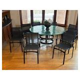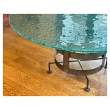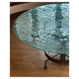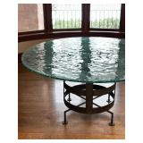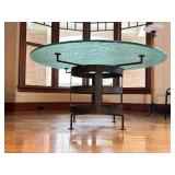 Custom Industrial Glass Top Dining Table, this table is unique from every angle, featuring an industrial steel/iron cylindrical base with splayed arms that support a thick, custom glass top with a heavy texture that mimics the dynamic, liquid appearance of water.